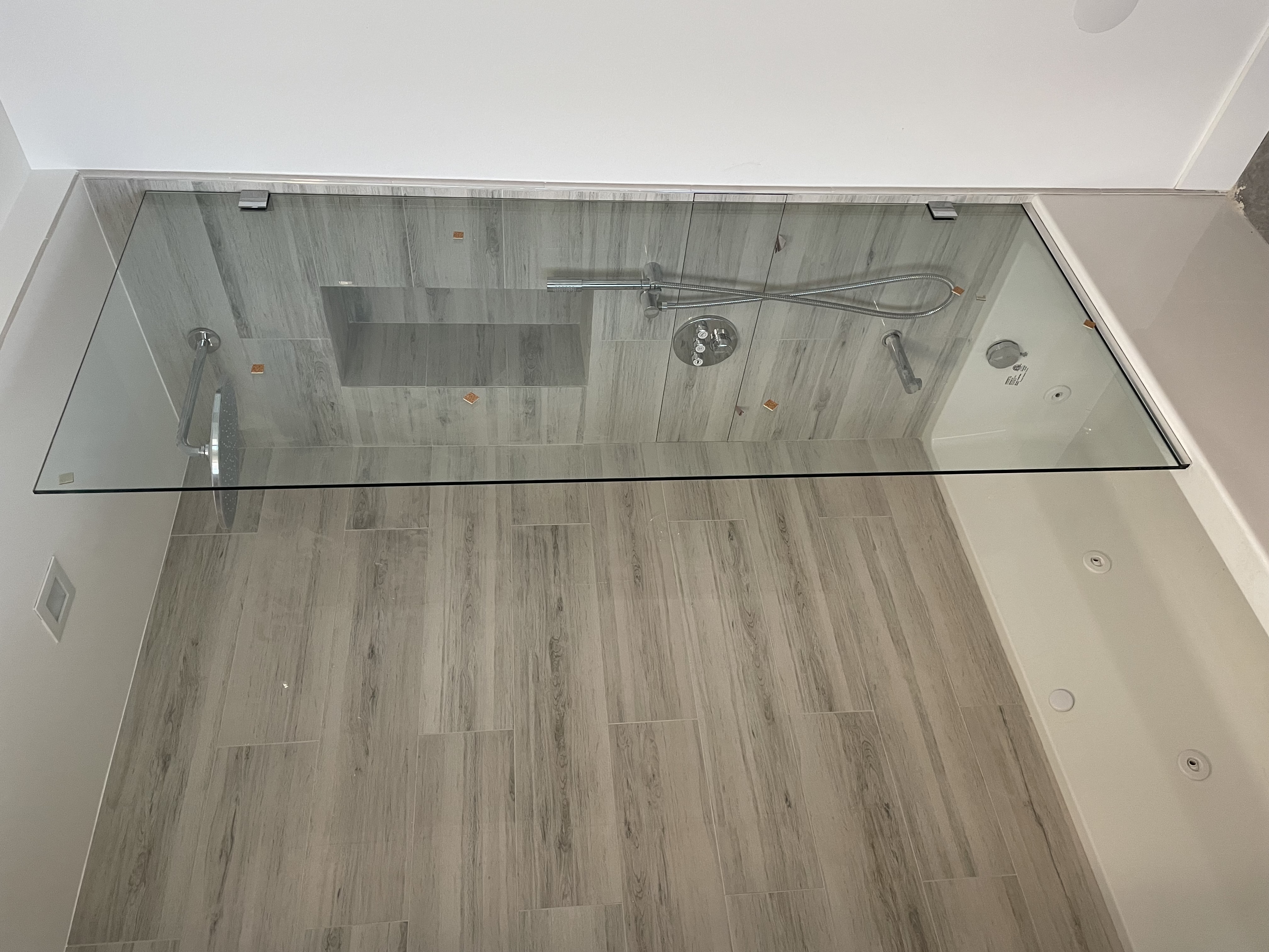 Metal clamps grip the glass at specific points. Typically uses two clamps mounted to the wall and one at the bottom for stability. This method is popular for its clean, minimalist look and allows for easy glass removal if needed.