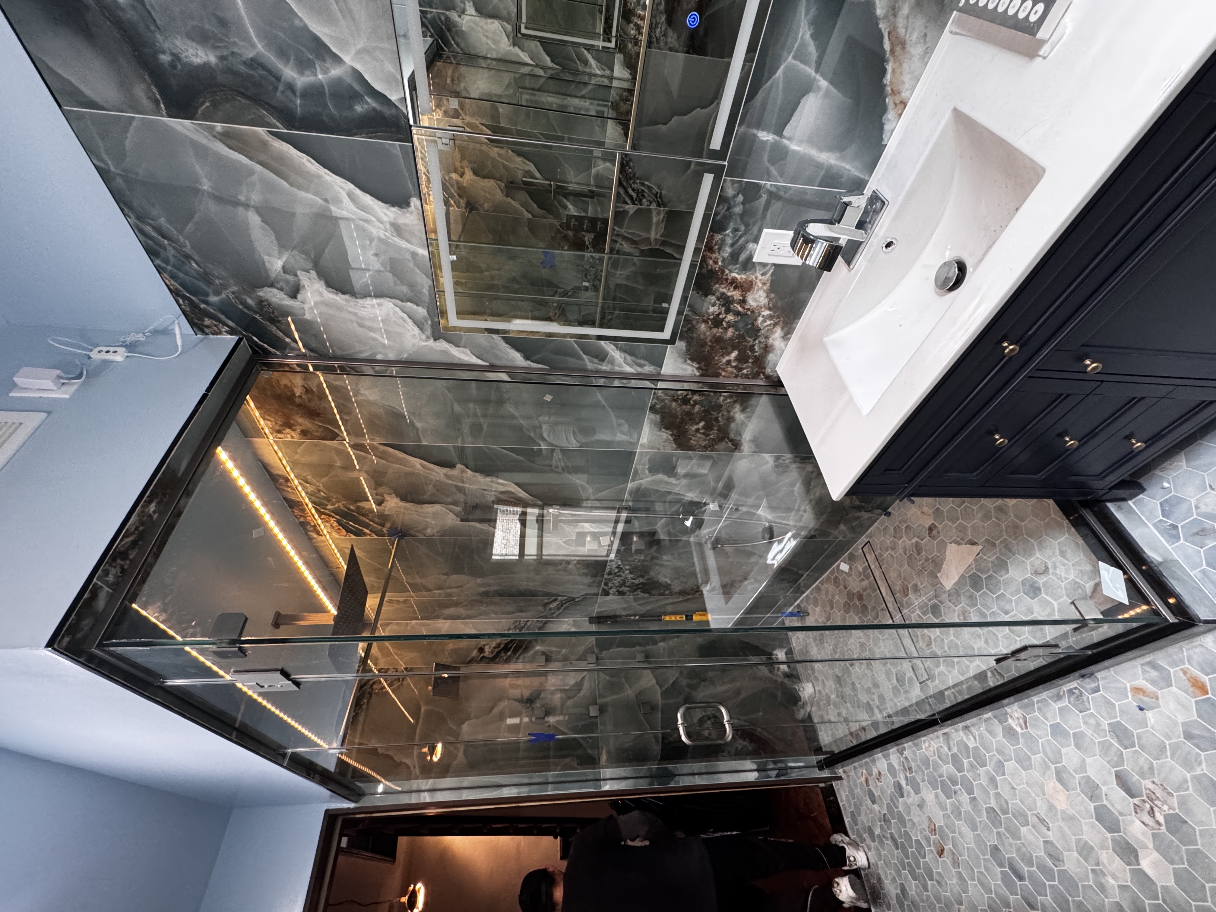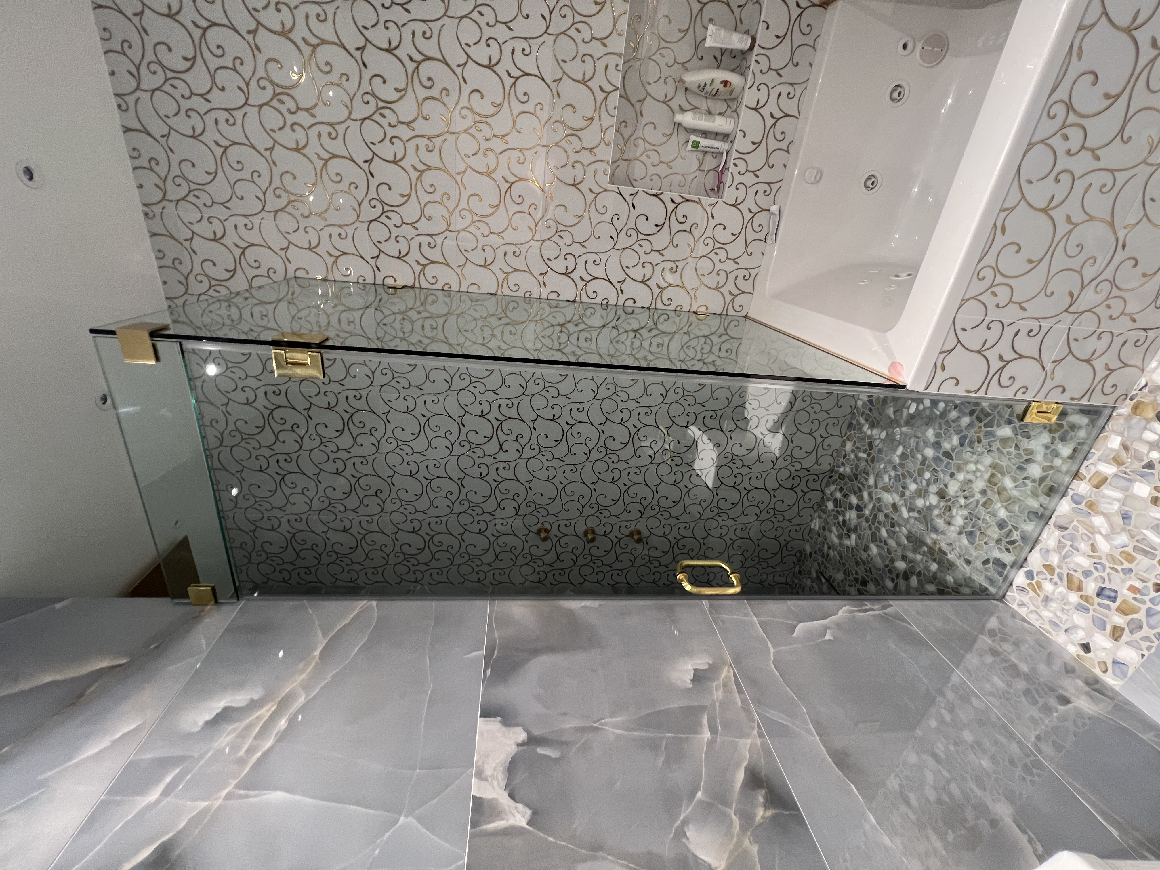 Metal clamps grip the glass at specific points. Typically uses two clamps mounted to the wall and one at the bottom for stability. This method is popular for its clean, minimalist look and allows for easy glass removal if needed.